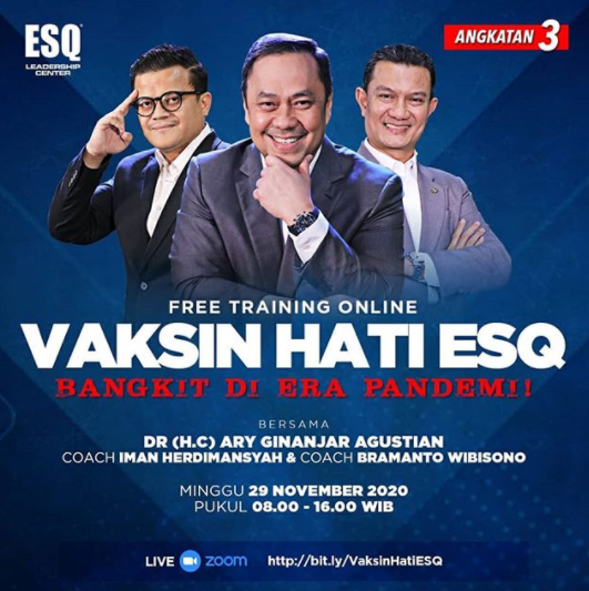 Training angkatan ketiga “Vaksin Hati ESQ, Bangkit di Era Pandemi” akan dilaksanakan pada Minggu (29/11/2020) pukul 08.00 – 16.00 WIB, bersama Dr. (H.C) Ary Ginanjar Agustian (CEO ESQ Group) via Zoom Meeting (Online) secara gratis. Dipandu juga oleh Coach Bramanto Wibisono dan Coach Iman Herdimansyah.