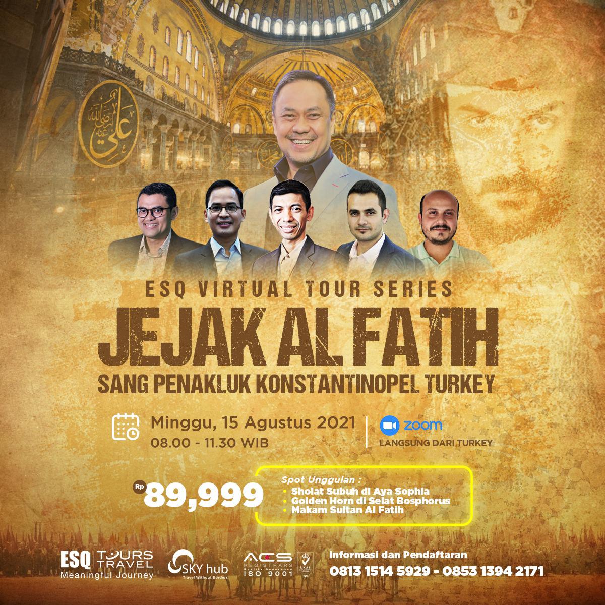 ESQNews.id, JAKARTA – ESQ Tours akan melaksanakan sebuah Virtual Tour Jejak Al Fatih pada Minggu (15/8/2021) pukul 08.00 – 11.30 WIB. Acara ini akan digelar langsung dari Turki melalui platform Zoom Meeting.