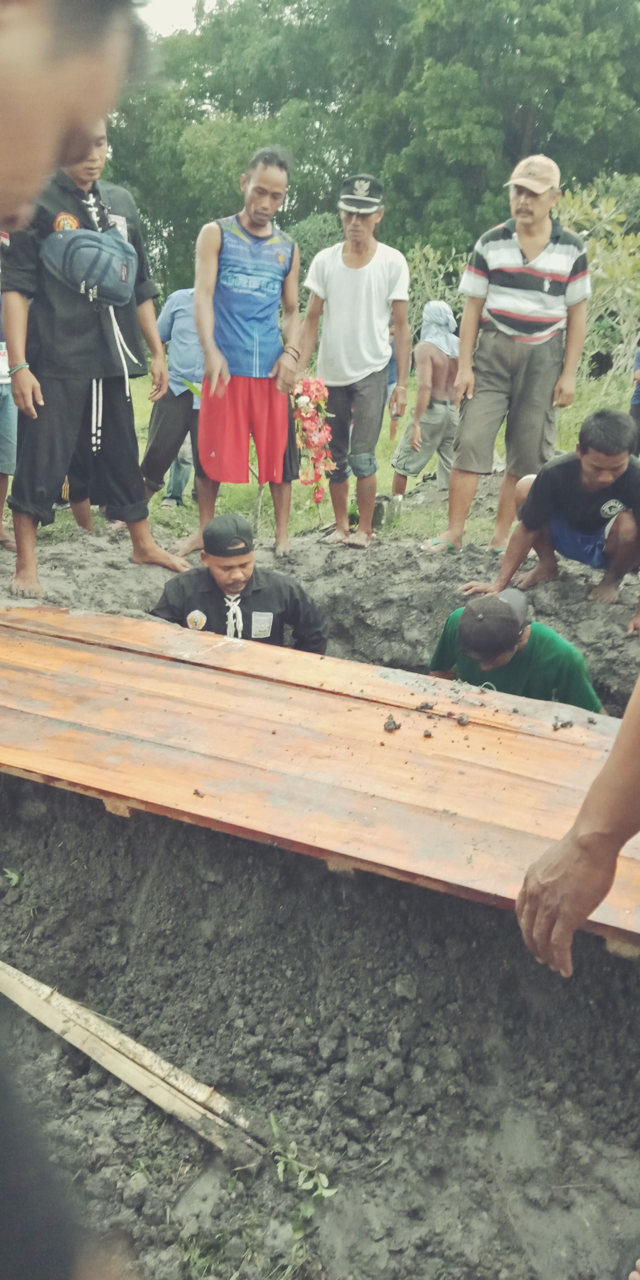 Sesampai di kuburan, jenazah dikeluarkan dari keranda. Tempat usungan mayat bertutup. Karena sangat berat, butuh sepuluh orang untuk mengangkat. Dengan susah payah dan tekad kuat jenazah dimasukkan liang lahat.