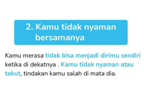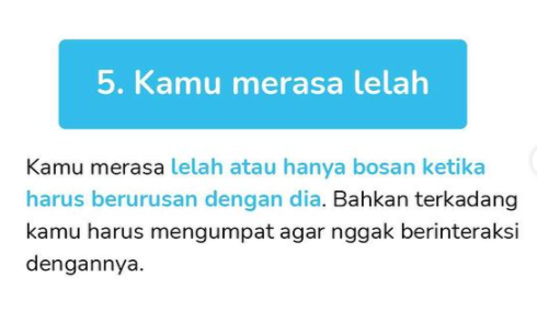 Biasanya dia akan membuat kamu merasa lelah dan serasa tidak mau bertemu sama dia. Selain itu, dari segi mental dan emosional kamu juga kekuras.