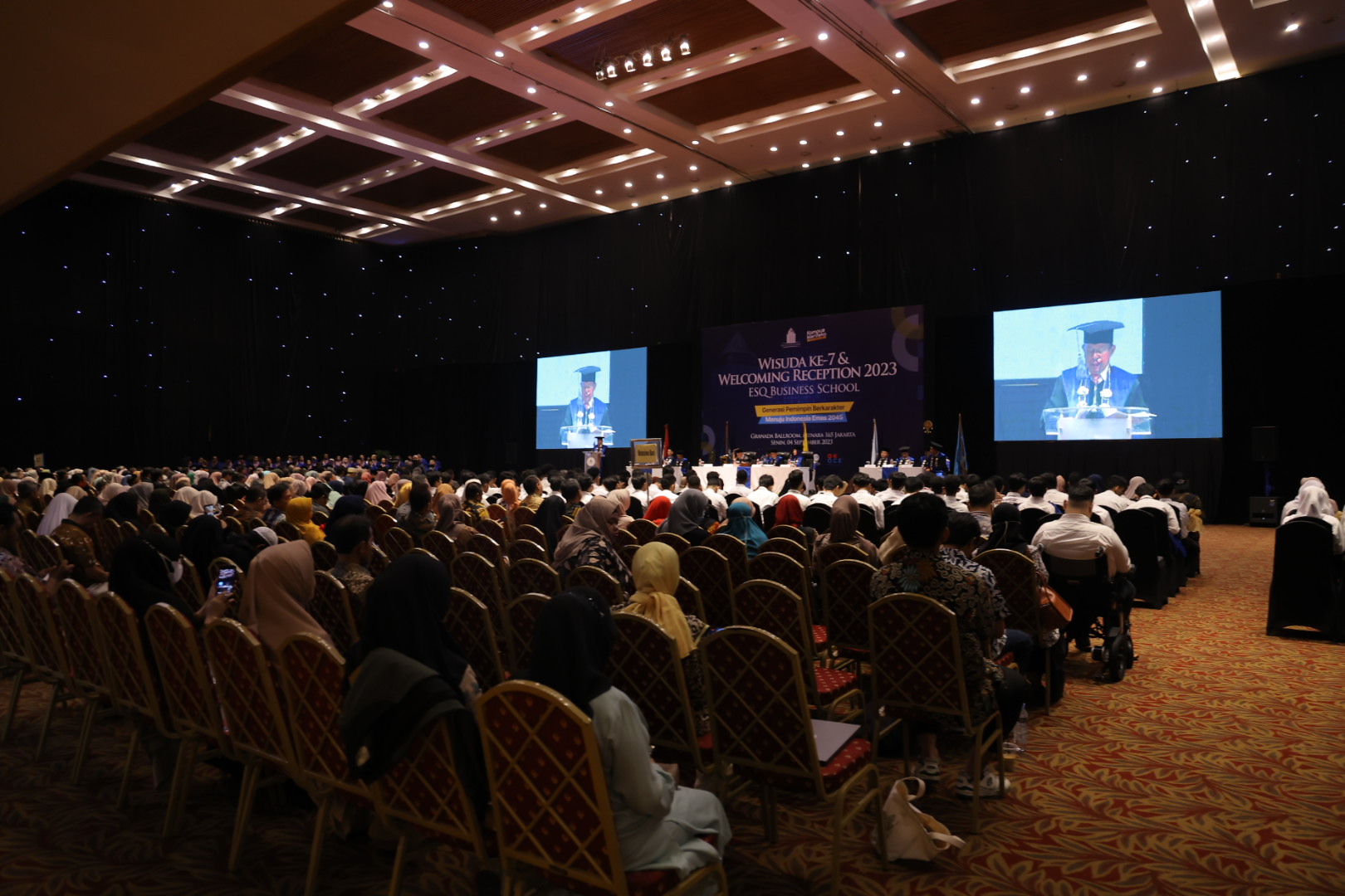 Lalu hadir juga Prof. Dr. Toni Toharudin, S.Si., M.Sc, selaku Kepala LL Dikti Wilayah 3, para tamu kehormatan, Korwil dan Korda serta anggota Forum Komunikasi ESQ, para dosen dan tenaga kependidikan, para orang tua dan pemberi beasiswa fellowship, para mahasiswi baru angkatan 11 ada 114 orang (46 orang mahasiswa baru adalah penerima beasiswa fellowship Generasi Indonesia Emas 2045), serta para wisudawan ESQ Business School (total 81 wisudawan, 4 wisudawan program second generation atau program khusus bagi penerus bisnis keluarga).
